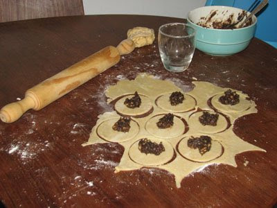- במרכזו של כל עיגול מניחים כחצי כפית מילוי. ומהדקים היטב לצורת משולש.